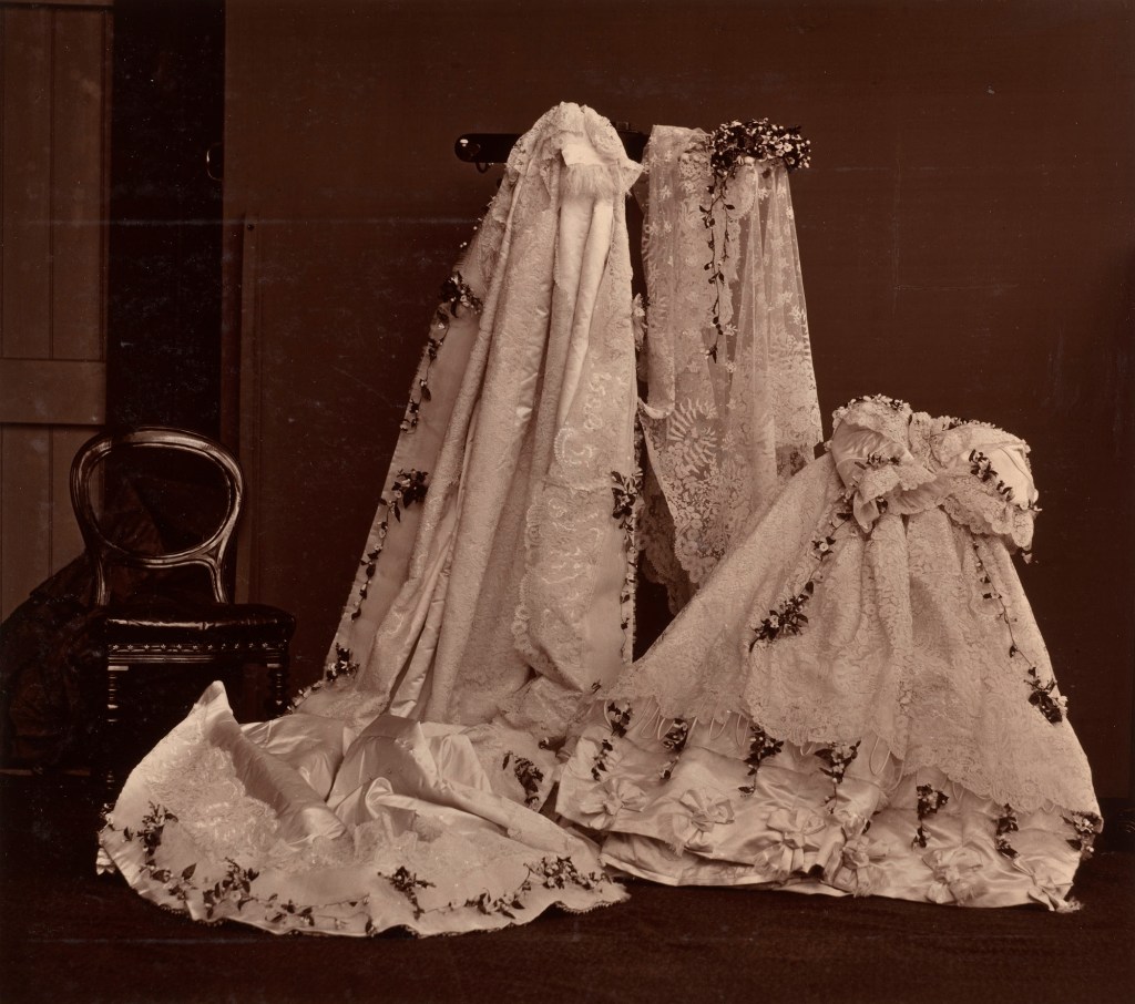 Following the trend set by her mother, almost 18 years before, the bride wore a white dress, made of moire antique, adorned with three flounces of Honiton lace (the lace was decorated with bouquets of roses, shamrocks, and thistles – to symbolise England, Ireland, and Scotland). Wreaths of orange and myrtle blossom decorated these flounces (the latter being the wedding flower of Germany), and larger bouqet of the same flowers was set in the centre of the bodice. The train was also white moire antique, trimmed with Honiton lace, and measured over three yards in length (approx. 9 foot). She also wore a diamond necklace, earrings, and brooch.