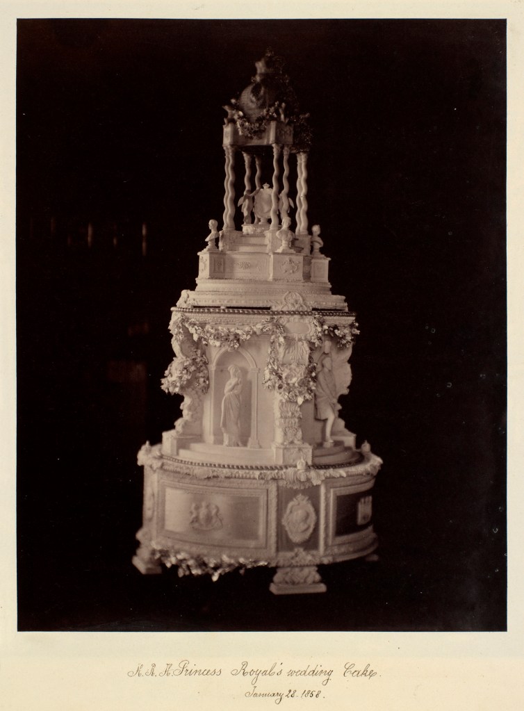 After that, they headed to the White Drawing Room for the wedding breakfast. Queen Victoria was seated between her Uncle Leopold and the Prince of Prussia (the groom’s father). She noted in her diary that: ‘The couple sat togeher, opposite us, but hid by a splendid wedding cake‘. The cake was highly ornamental and featured decorations modelled on neo-classical sculptures.