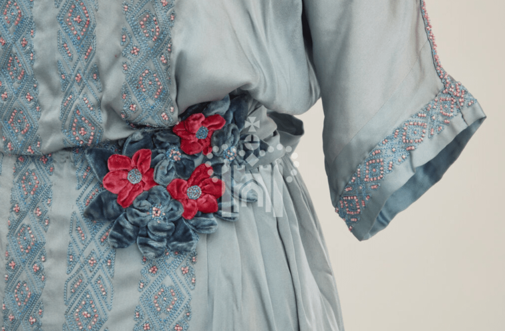 Before leaving for their honeymoon, Princess Mary changed into her going away outfit which was made by Handley Seymour, a London based designer who went on to create both the wedding and coronation dresses of Queen Elizabeth, the Queen Mother. Mary’s dress, part of the Historic Royal Palaces’ Royal Dress Collection, is described as a blue silk charmeuse dress with a boatneck and short kimono sleeves. It was decorated with bands embroidered in blue silk, accented with crystal and pale pink coral beads. The dress featured a self sash and a blue velvet rose corsage at the waist, with a beaded detail.