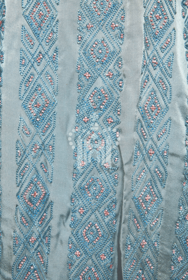 I managed to view some images from the Royal Ceremonial Dress collection recently, and found amongst them a further picture of Princess Mary’s going away outfit. An image of a small blue and coral ‘lucky’ horseshoe embroidered inside the hem of her dress.