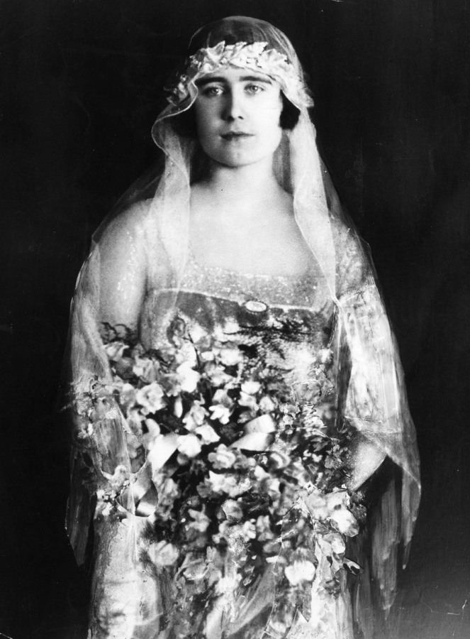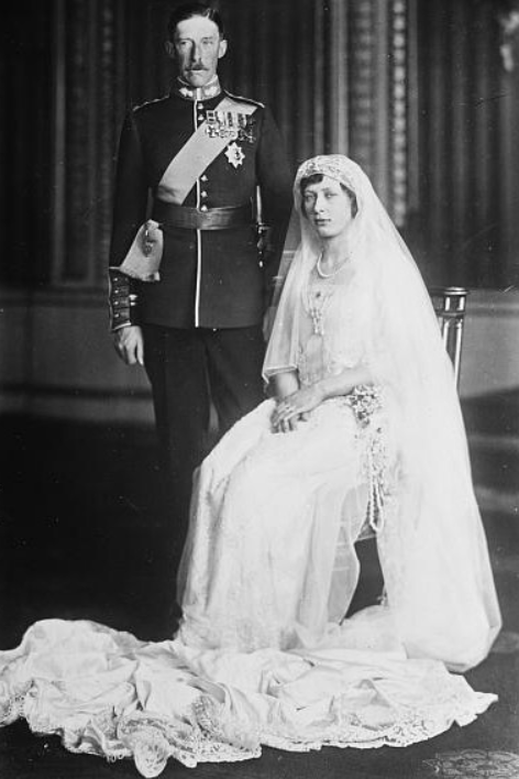 The groom wore the uniform of the Grenadier Guards along with his Order of the Garter blue sash, which had been presented to him by King George V the day before. And Queen Mary, always resplendent, wore a gown of rich cream and gold lace with velvet brocade. Like the bride’s dress, hers also featured a rose design. She completed her outfit with a white tulle toque, adorned with ostrich feathers tipped in gold.