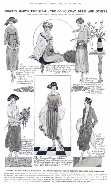 Ahead of the ceremony, details of Princess Mary’s trousseau were revealed. It was described by The Gentlewoman magazine as ‘full of charm and beauty. Delightful colours, blues of every shade, pinks and mauves, are all blended in iridescent effects, while the dresses portray, in mode and draperies, the most becoming lines of the present fashions.’