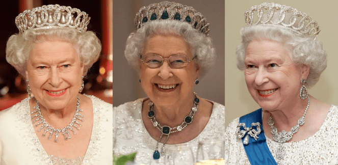 When not in use, the tiara is stored in a fitted leather case, and the jewels are kept in numbered velvet bags. In her book, The Other Side of the Coin, the Queen’s Dresser, Angela Kelly, reported that it can take up to an hour to switch the jewels out.