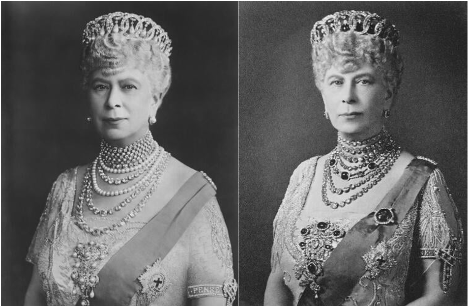 Soon after her purchase, Queen Mary entrusted the tiara to royal jewellers, Garrard, to repair the damage caused during the flight from Russia. And then, three years later, she had them work on the piece again, adding in a mechanism that allowed her to easily switch out the pearls for fifteen emeralds from her own collection.