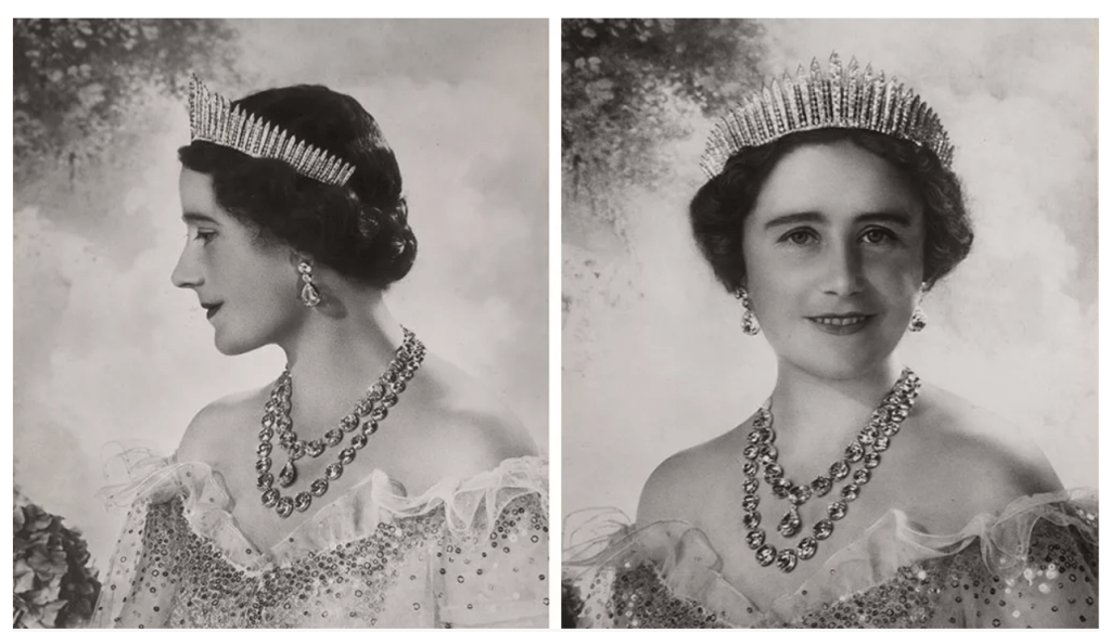 In the images below, she can be seen wearing both necklaces, along with the Coronation Earrings, Queen Mary’s Fringe Tiara, and a beautiful silk tulle gown created by Norman Hartnell. They are part of a series of portraits taken of The Queen in 1939 by celebrated photographer, Cecil Beaton.