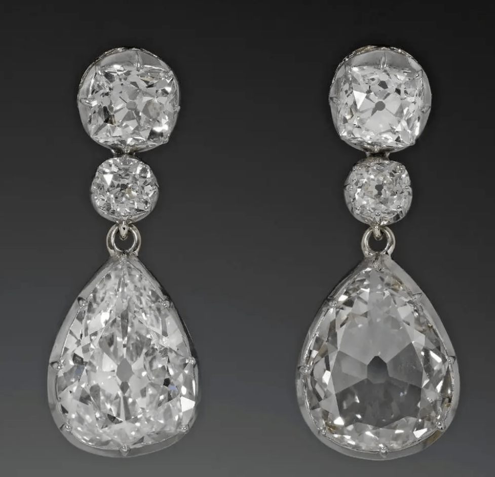 The earrings were composed of cushion-cut diamond studs, each set with a round brilliant and a large, pear-shaped diamond suspended below – the two drops are non-matching. In keeping with the royal’s tradition of repurposing existing jewels, the pear-shaped diamonds had previously formed part of the armlet setting created for the Koh-I-Noor