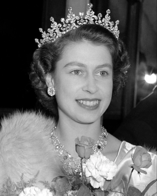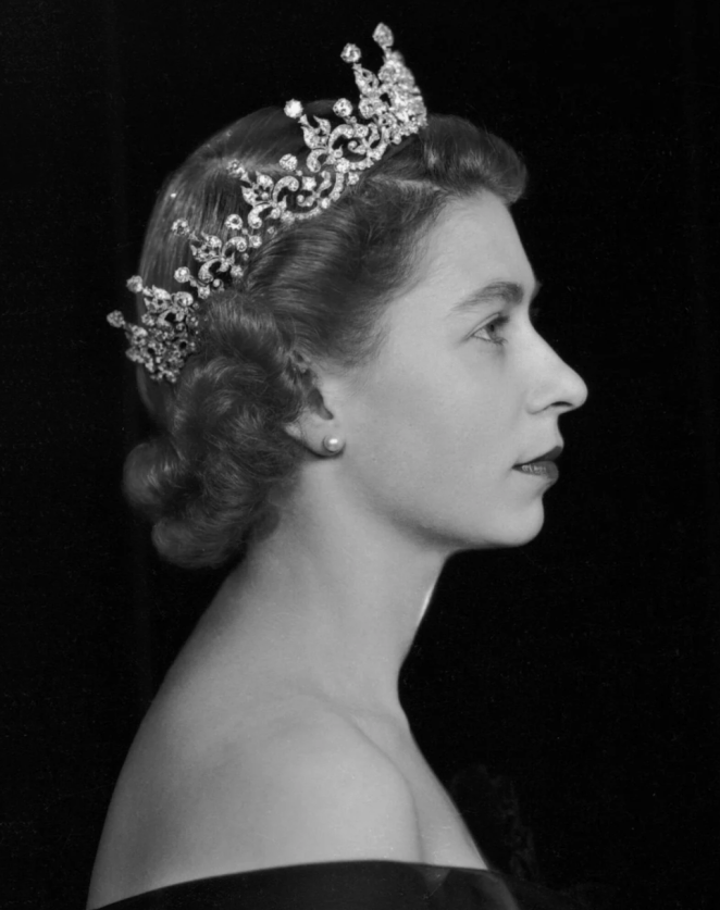In 1951, she wore the tiara for her 25th‑birthday portrait, her last before becoming Queen. Then Princess Elizabeth, she was pictured wearing a grey silk gown, the tiara, and a pearl necklace.