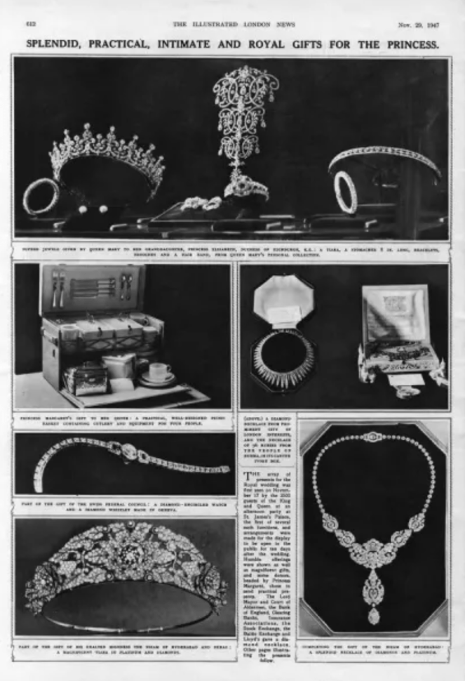 In 1947, Queen Mary passed the tiara to her granddaughter Princess Elizabeth as a wedding present. The gifts were displayed at St James’s Palace, and photographs from the exhibition show that the tiara still included its detachable bandeau base.