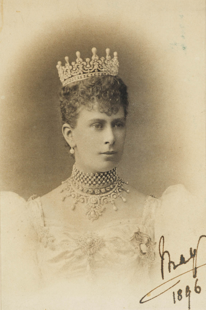 Adverts were placed in regional newspapers across the British Isles inviting local girls to donate any sum from ‘One Penny upwards’. A sum of just over £5050 was raised, a testament to the popularity of the young royal couple. Of this, £4,600 was spent on a “pearl and diamond tiara,” a design Princess May chose herself. An entry in Garrard’s Royal Ledger dated 26th June, 1893 records the commission succinctly: “A diamond band and scroll pattern tiara surmounted by fine drop pearls.”