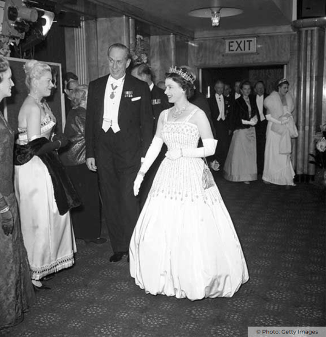 In 1962, The Queen attended the Lawrence of Arabia premiere at the Odeon Leicester Square. She paired the tiara with a beautiful Norman Hartnell evening gown, which was made from ivory Peau De Soie taffeta, embellished with diamantés, and trimmed with Duchess satin. Almost 60 years later, her granddaughter, Princess Beatrice, chose this very dress for her own wedding gown.