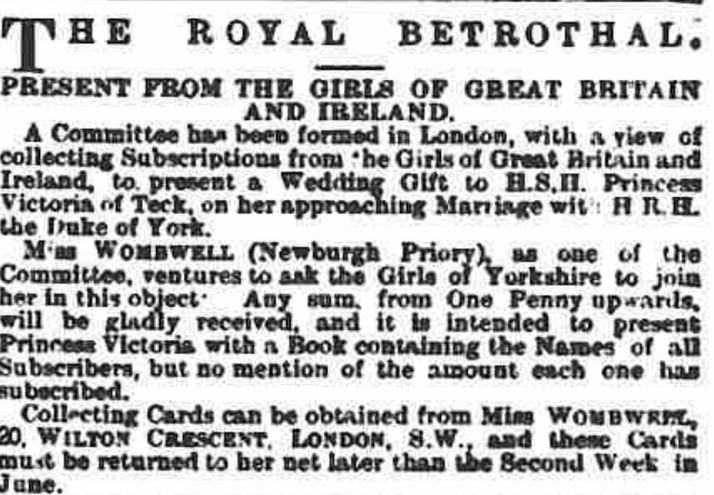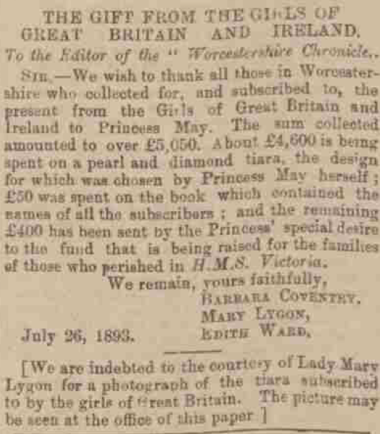 In 1893, as Princess Victoria Mary of Teck readied for her wedding to Prince George, Duke of York, a committee of women from across Great Britain and Ireland assembled. Led by Lady Eva Greville, daughter of the 4th Earl of Warwick and later one of Mary’s ladies‑in‑waiting, they launched a fundraising campaign to present the bride with a worthy and beautiful gift.